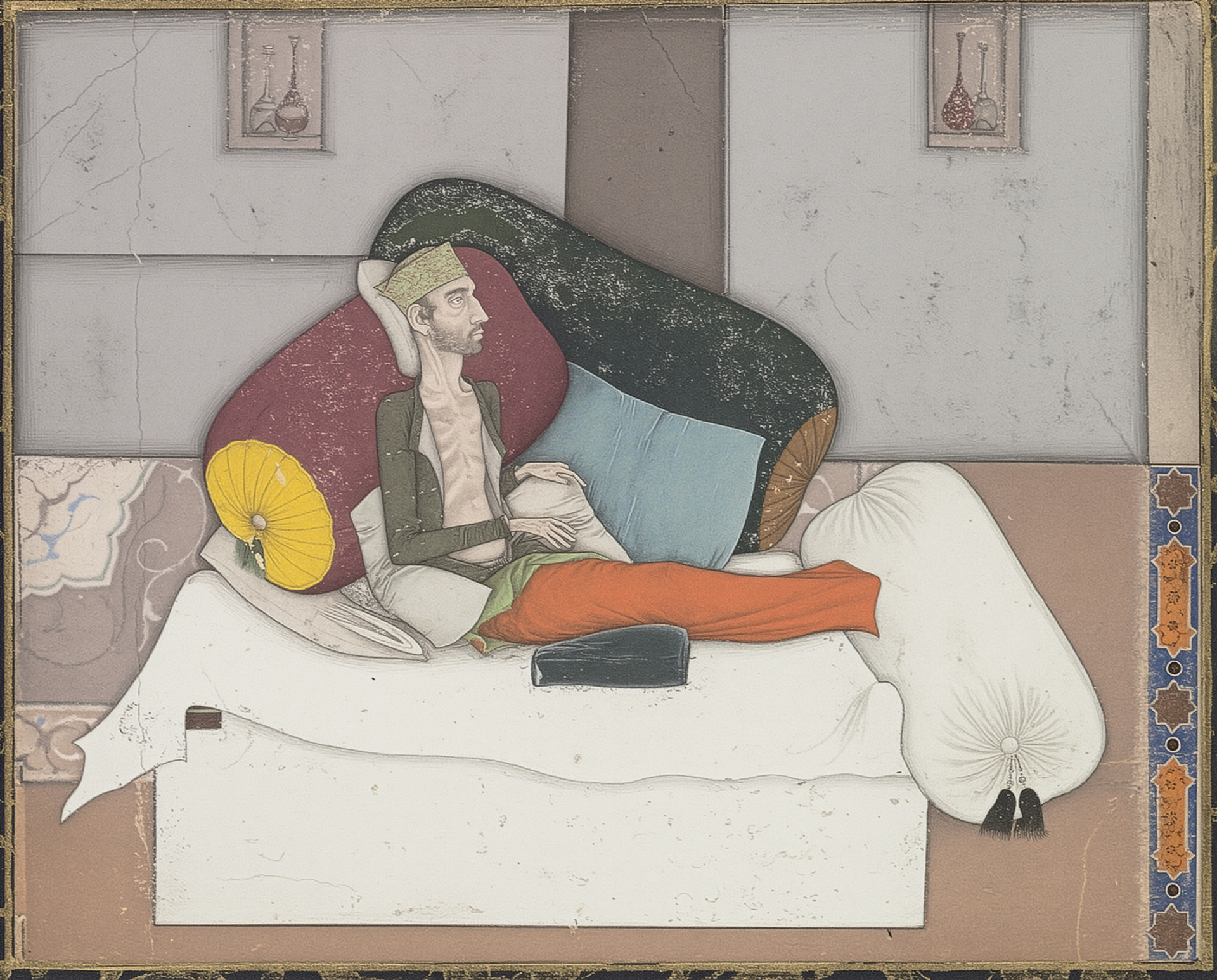 ‘Inayat Khan’s Bed’ reimagines a 17th-century Mughal miniature painting that depicts the nobleman, Inayat Khan, on his deathbed, weakened by opium and alcohol addiction.
