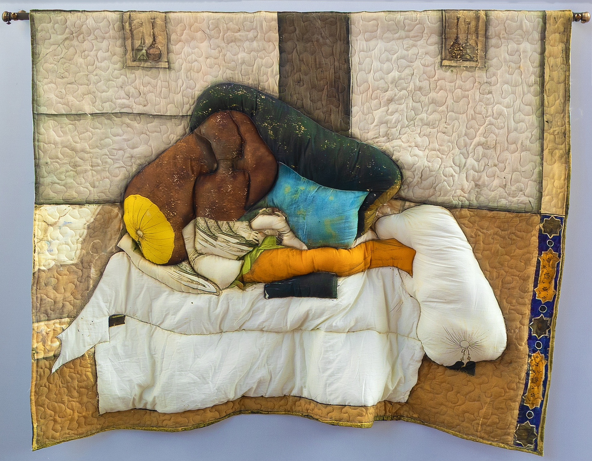 This quilt, scaled to the dimensions of a Mughal day cot, is an homage to his bed—a space of comfort and rest, but also a witness to pain, illness, and the quiet violences that mark the body. What does a bed remember of those it once held?