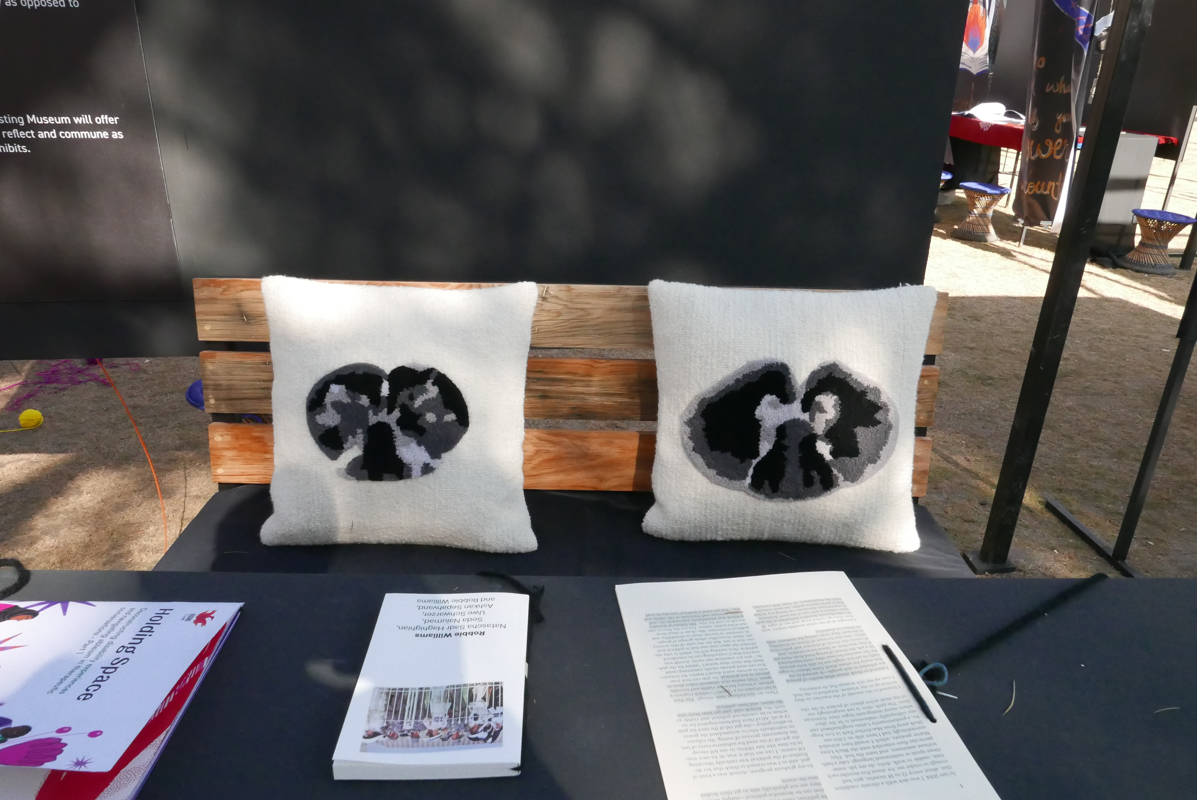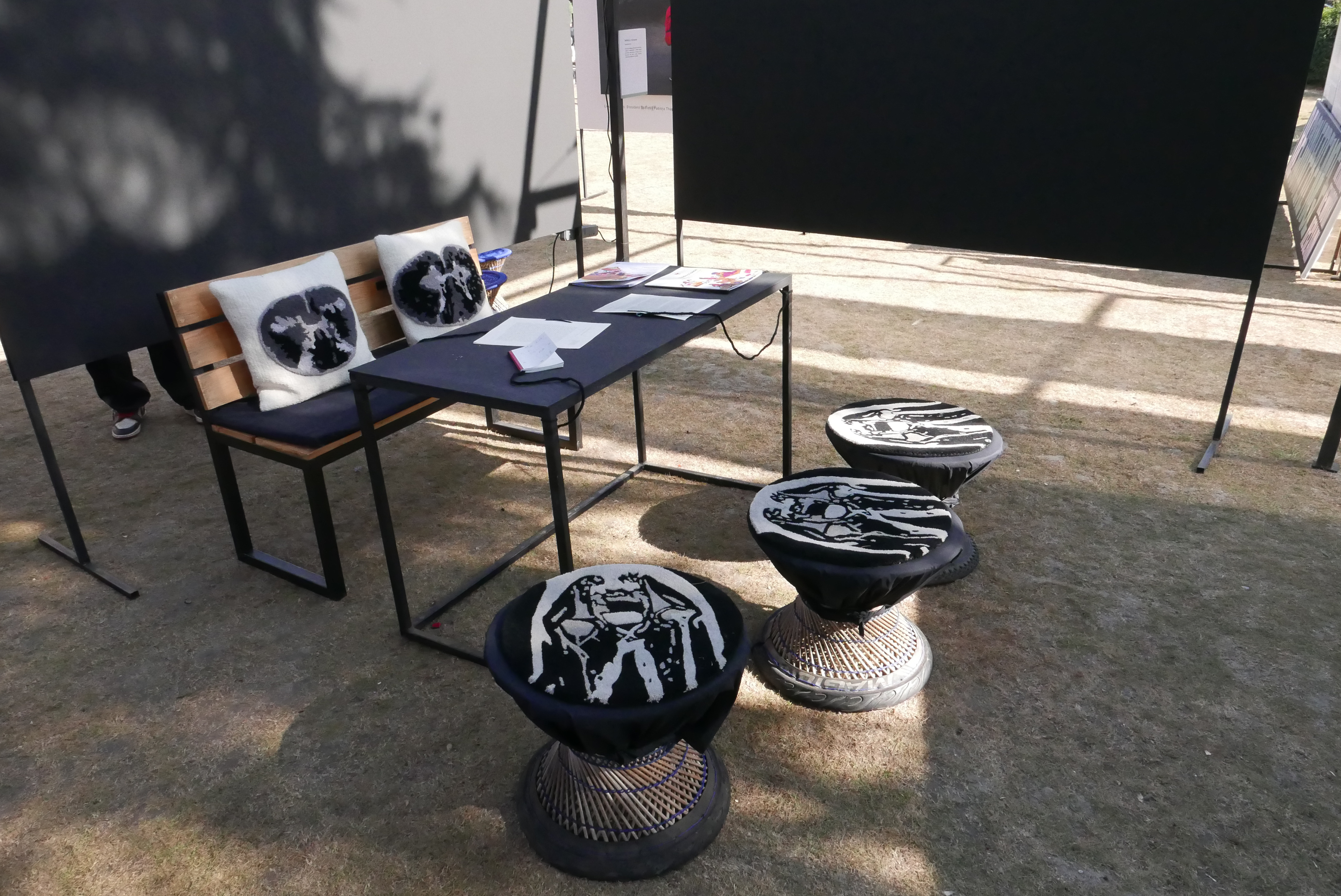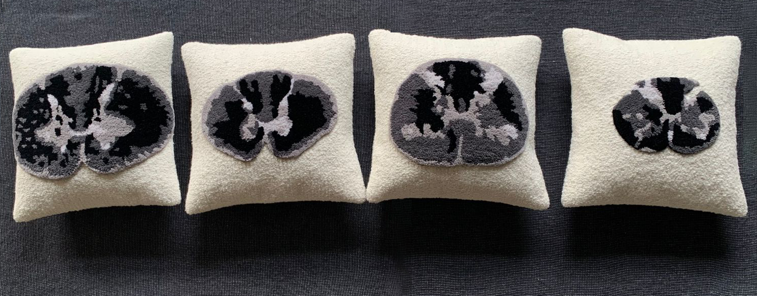 These circular seat cushions are tufted with the CT scan of an osteoporotic pelvic joint that can make activities like sitting on this seat difficult.