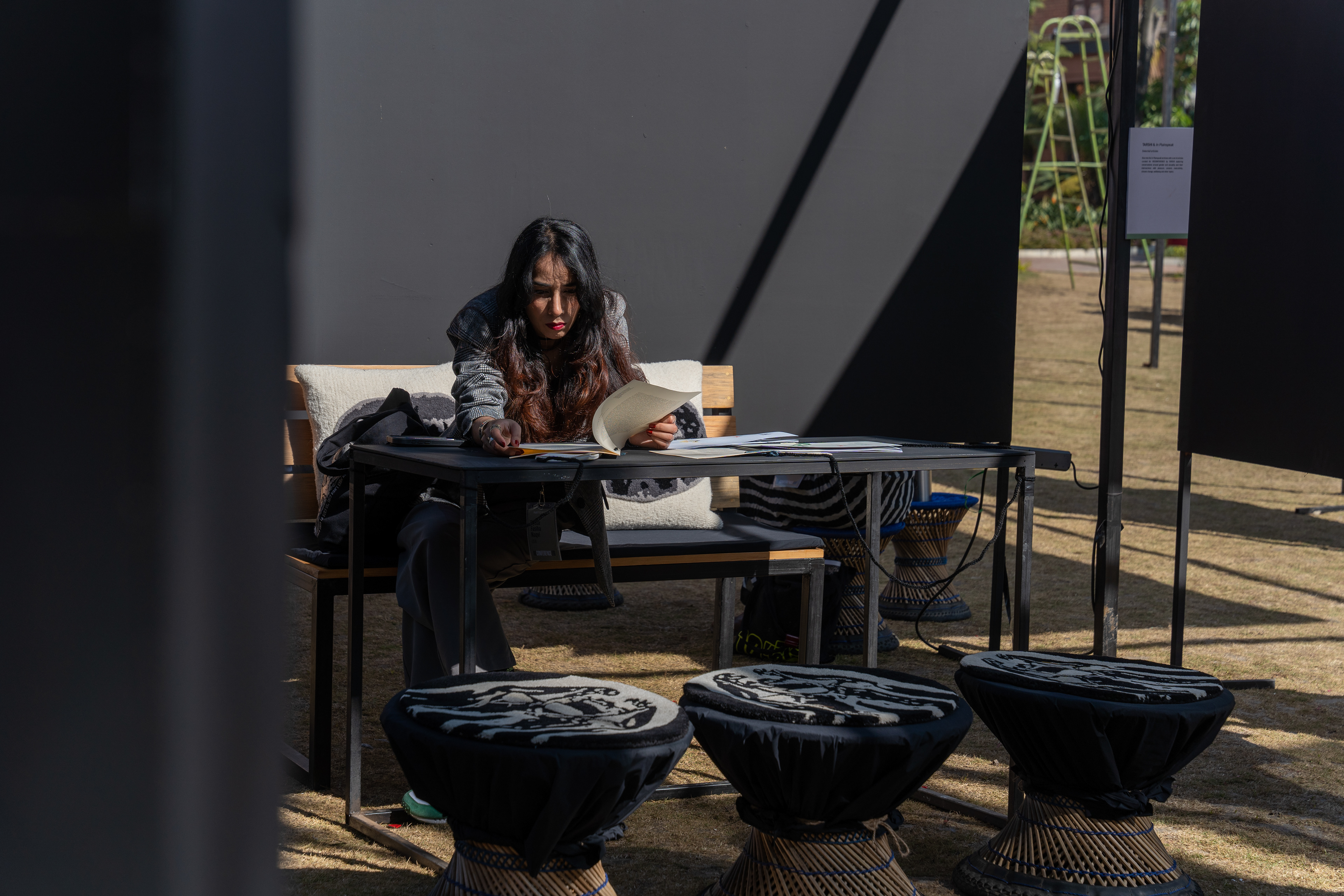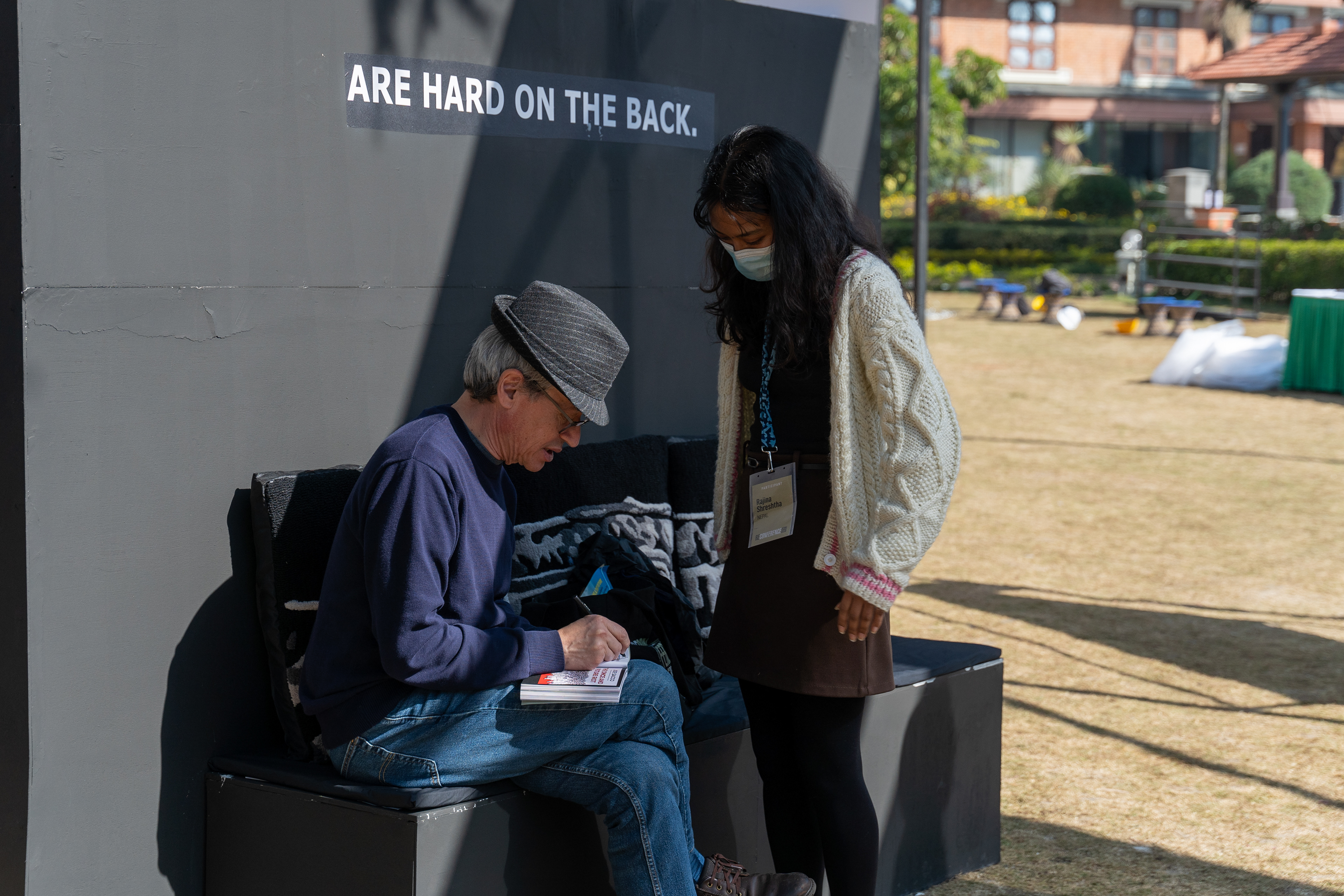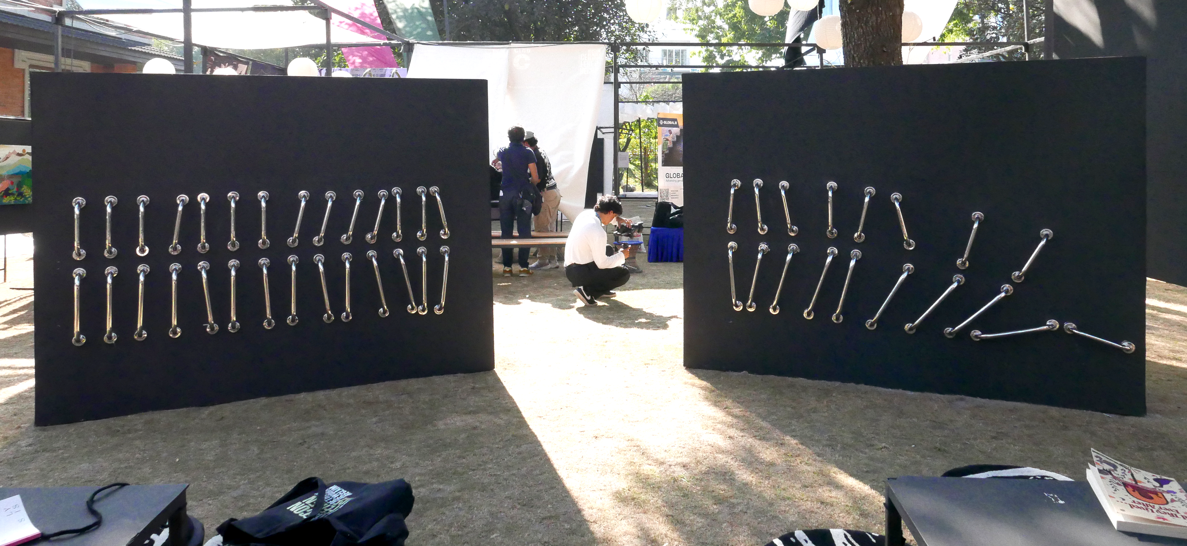 A reiteration of our sculptural installation of grab bars illustrating a hyper-flexible knee joint during a fall, referencing Eadward Muybridge’s photographic documentation on human mobility.